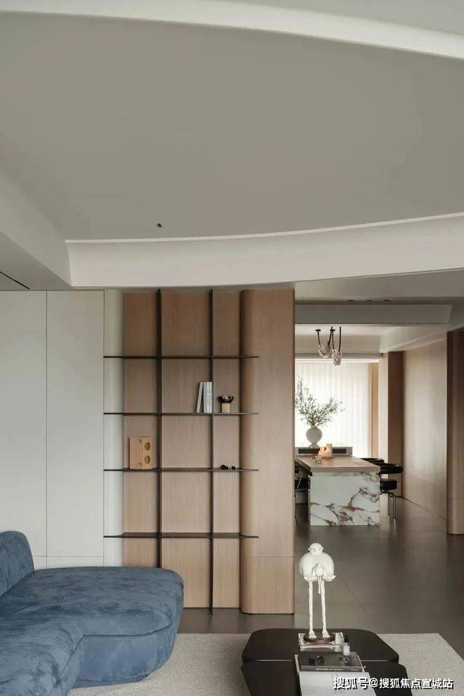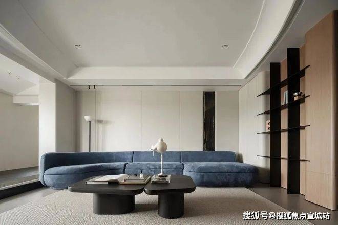 步入客厅,圆弧吊顶的曲线柔和了空间的边界,落地窗将自然光引入室内,形成开阔的视觉感受。木质墙面与蓝色沙发的搭配,在温暖与冷静之间找到平衡,而电视墙的黑色饰面则赋予空间一抹现代感的锐度。
