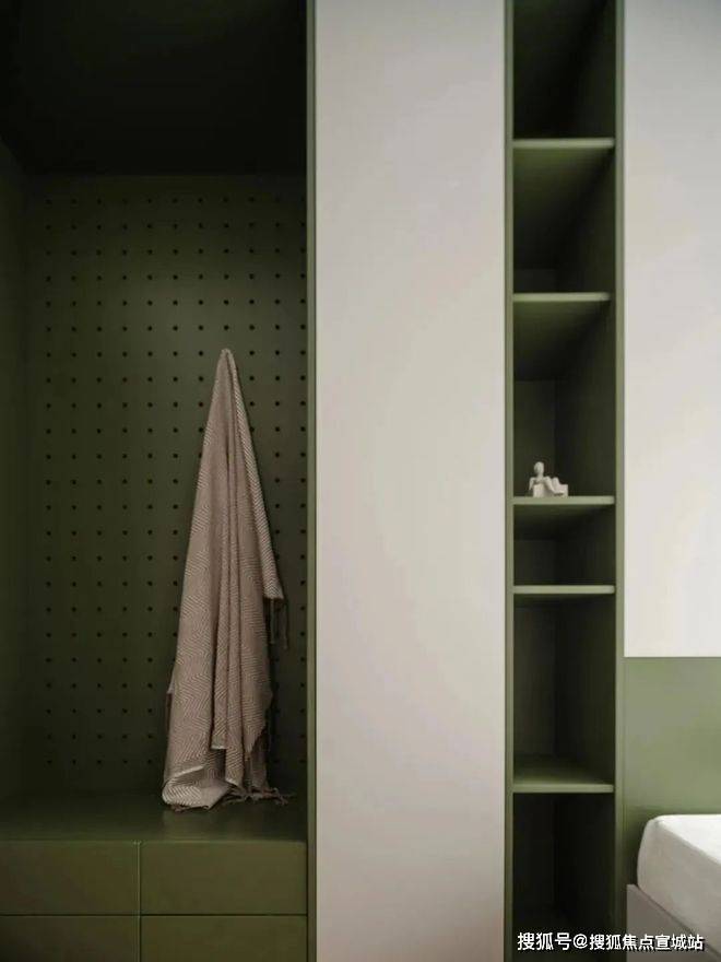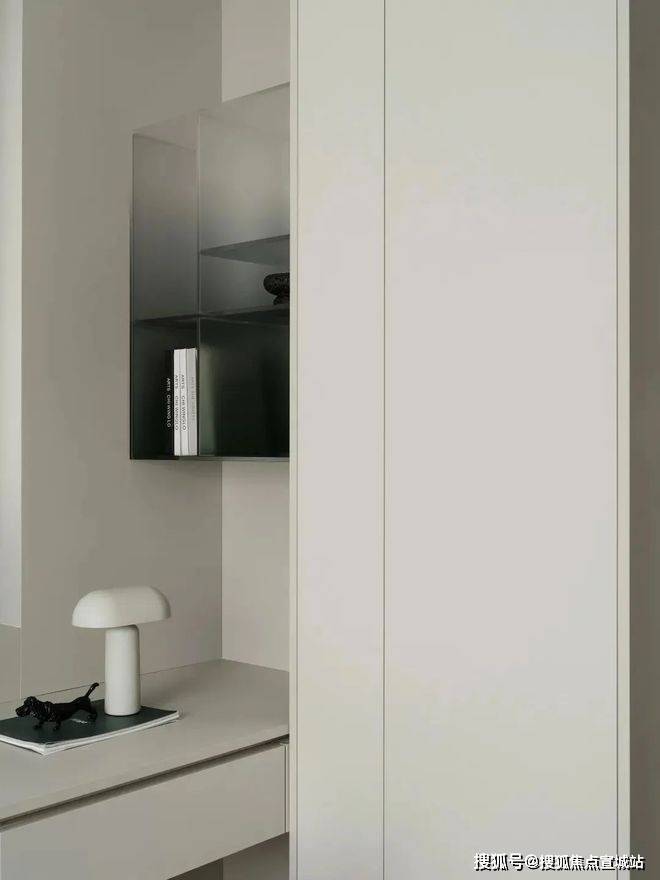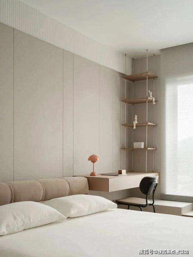 次卧则以功能为导向,通顶柜体与悬浮书桌优化了收纳效率,极简的书柜设计让空间回归干净利落的本质,满足高效生活的需求。