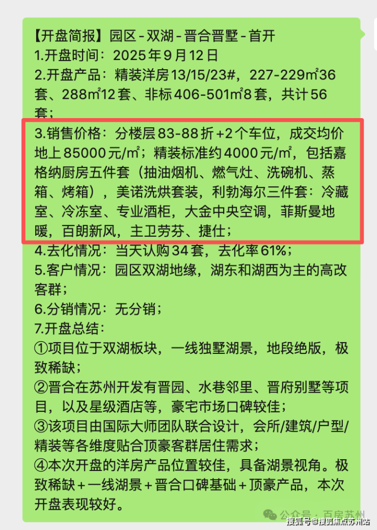2025年9月12日,园区双湖板块的星合晋墅项目迎来首次开盘。首批推出的56套精装洋房,尽管单套总价高达数千万元,却在当天实现34套的认购量,去化率超过六成,截止发稿日可售房源不多。