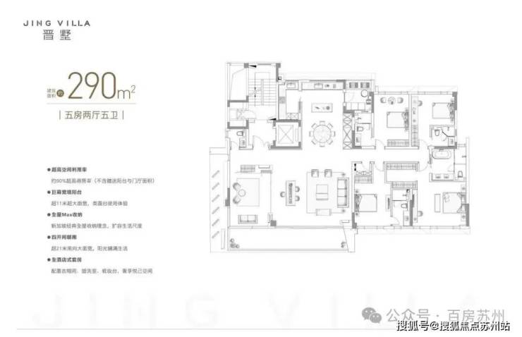 290㎡户型则规划为5房5卫,得房率高达90%,四开间朝南设计,面宽达12米,并配有11米巨幕阳台。