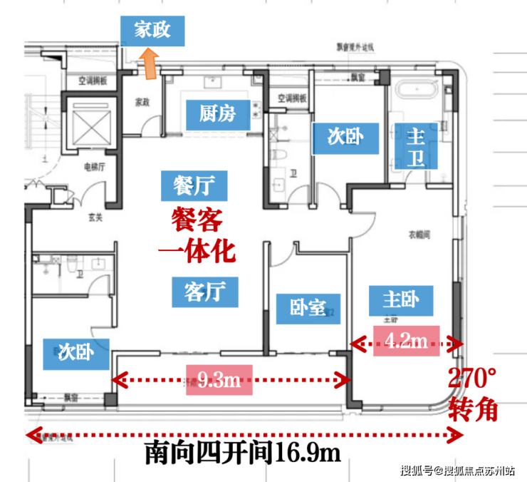 户型方正,四开间朝南,奢阔南向面宽达约16.9米,尽显空间掌控力;约9.3米南向贯通阳台衔接6米客厅;南向3个卧室均采用大面宽设计,采光与舒适兼得;