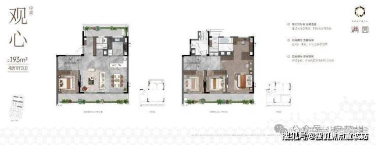 叠加约168/193㎡,均为4房3卫的舒适户型,房间全部朝南,客厅挑空,下叠带南北双花园,上叠送大露台(无需二次改造),哪怕中叠也带一个约10平的露台。满园