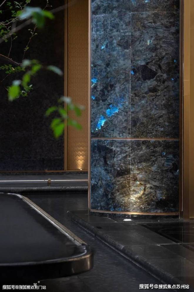 主入口院墙由范思哲黑奢石打造,中间三重檐与电动移门均采用透光石材,局部以金丝玉琉璃进行装饰;两边臻选蓝翡翠玉石,定制弧形曲面,勾勒百合之韵,整体展现出百合层叠绽放的姿态。