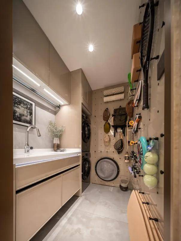 家政间采用模块化仓储系统设计,可实现洗衣机 + 烘干机叠放,同时为清洁工具、换季杂物、日用囤货预留了专属收纳位,关上门就能彻底隔绝家务杂乱。