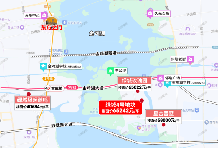 交通上来说,北面靠近金鸡湖大道,直接连接湖西和湖东,往西能上东环,基本上能快速去往核心区。南面靠近独墅湖大道,连接东南环,东面有星湖街,直接串联湖东。