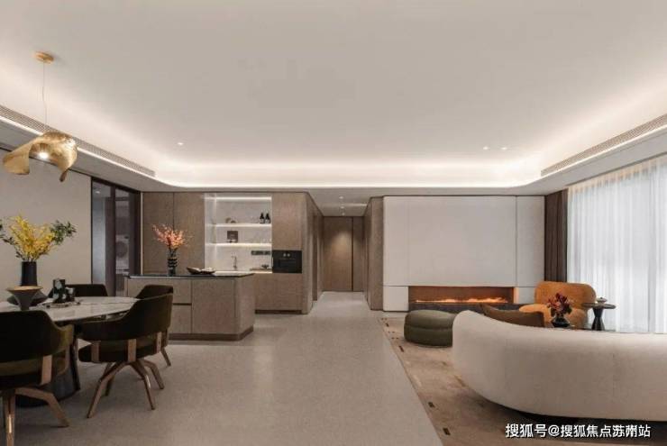 该户型餐客厅面宽约7米,配上几乎同宽的落地窗,随意向外一瞥,就是全画幅的流转景致。