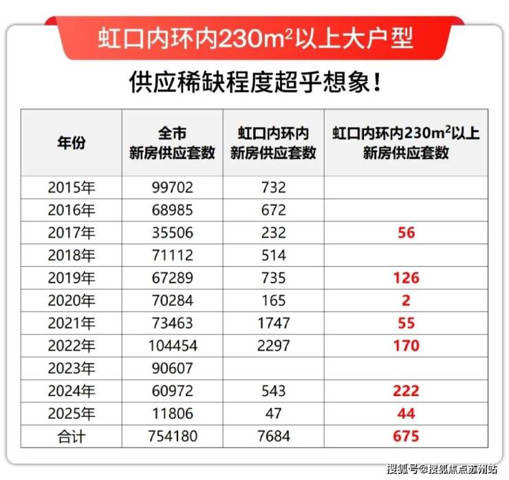 而虹口内环内建面约230㎡以上的改善户型供应套数要再缩减10倍,只有675套,占比总池子约0.1%。堪称:10年难遇,千里挑一!