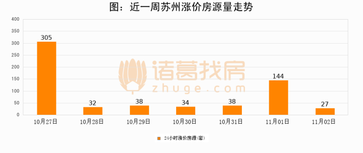 根据诸葛找房数据显示,苏州24小时涨价房源量为27套,较11月01日减少117套,环比下降81.2%。与此同时,涨价房源占比小幅回落,对于购房者来说是一个入市窗口期,购房者可抓住时机入市。