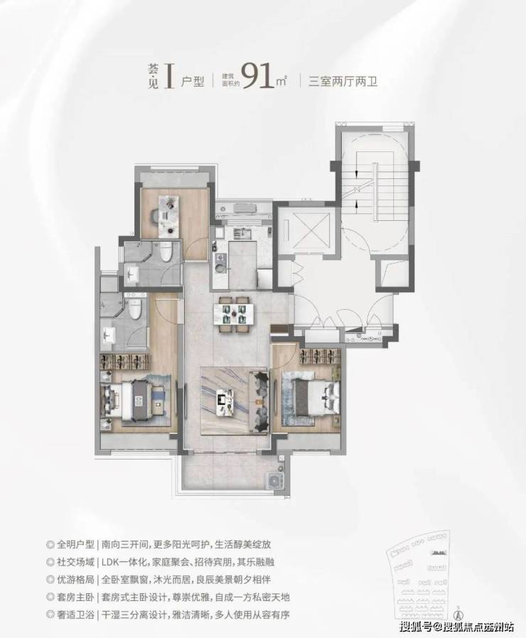 市面上90㎡左右户型两房居多,华发海上都荟建面约91㎡直接 3房一步到位,并且有2卫配置, 主卧进阶套房,功能性远超同价位竞品!