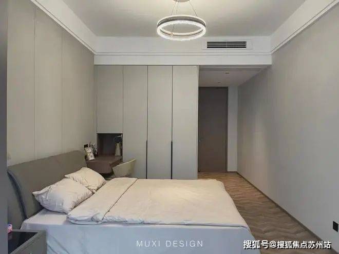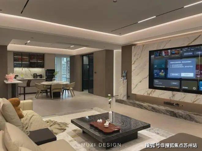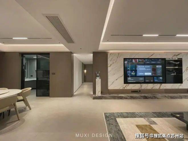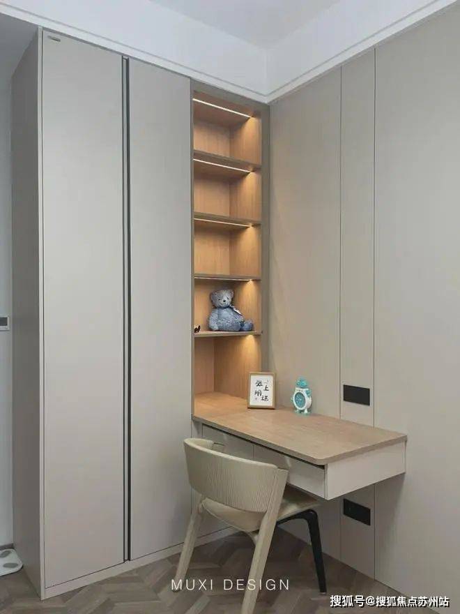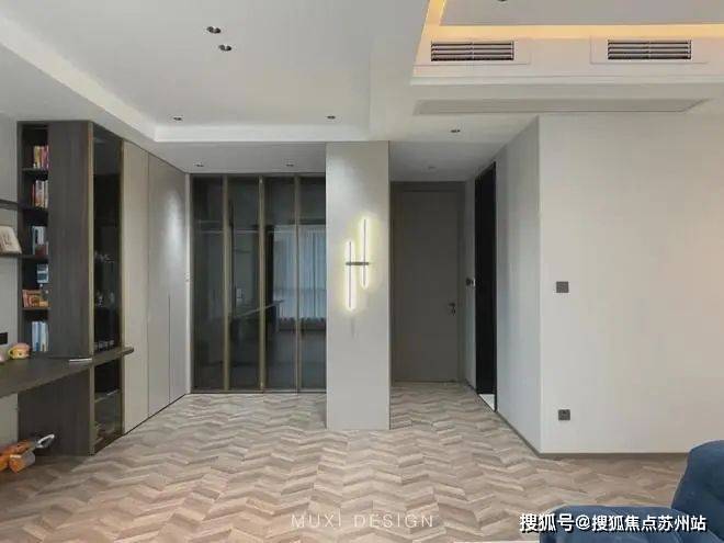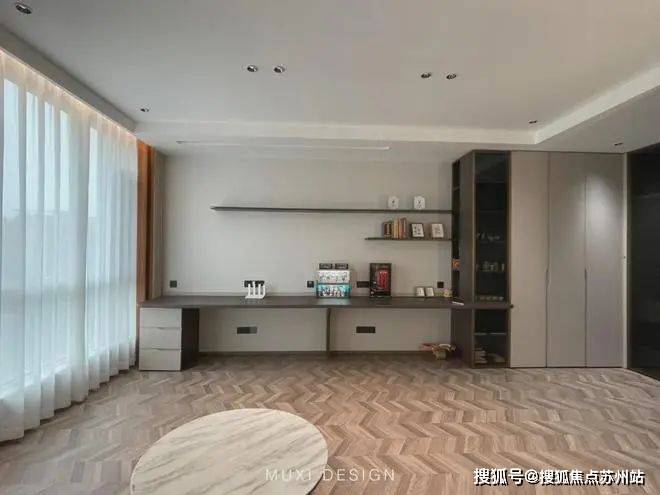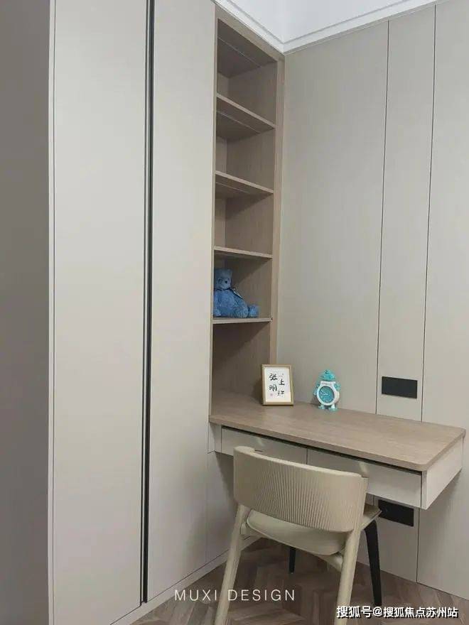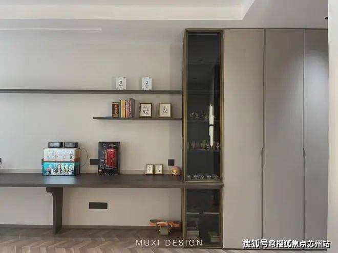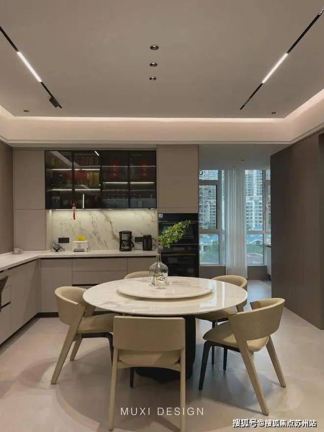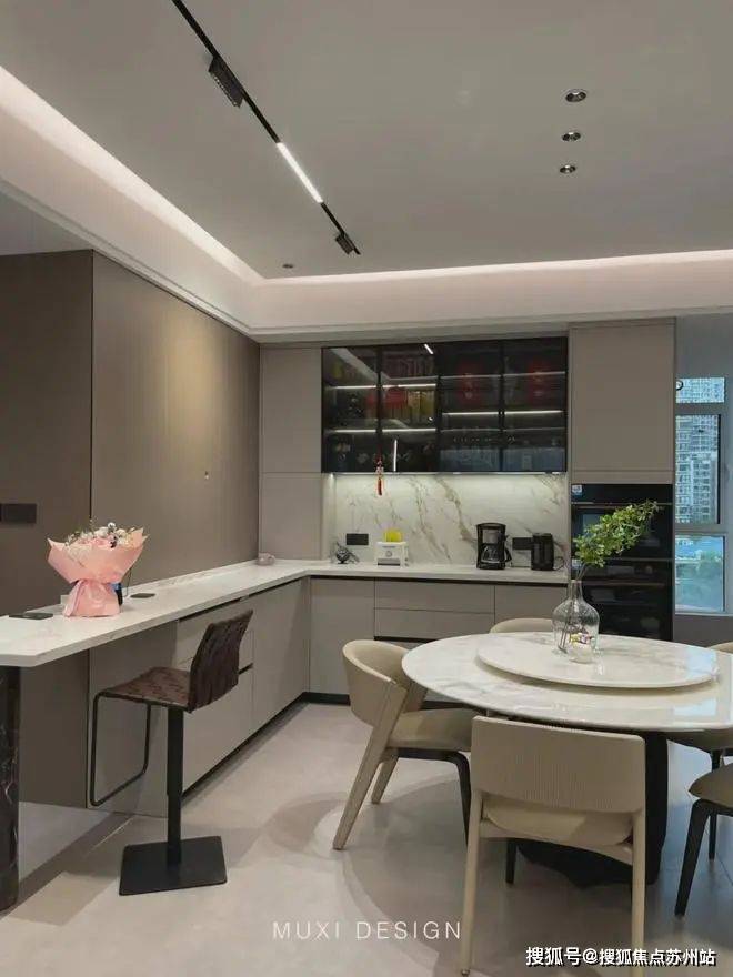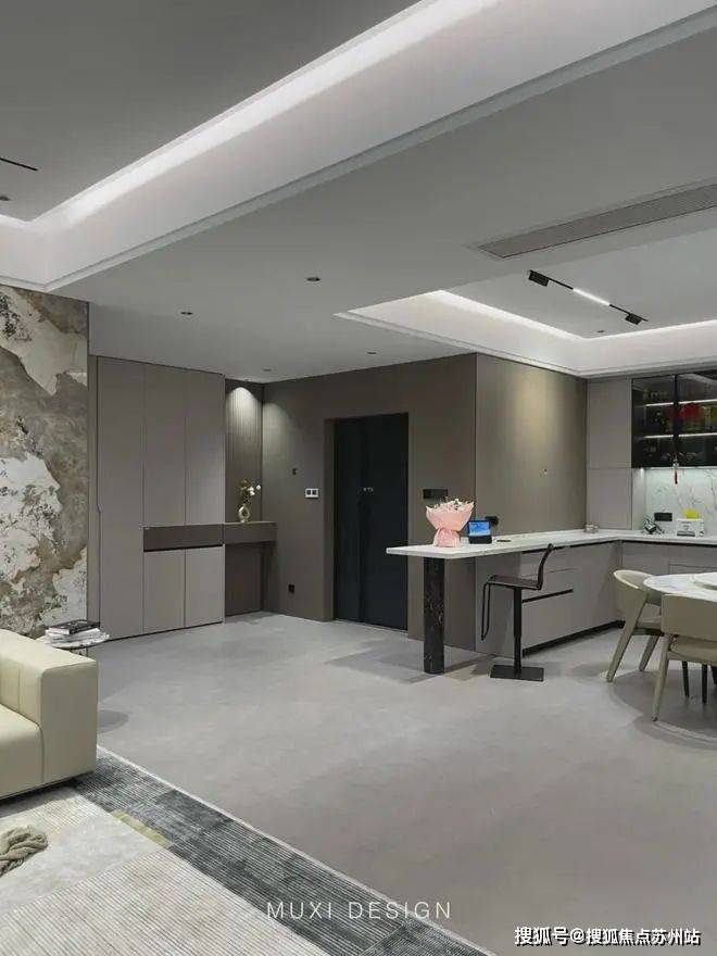 一进门就能看见顶天立地玄关柜,中间做了处理,白色柜子插入一道棕色隔板,让玄关整体不那么呆板。客厅背景选用栅格栏和岩板的组合,中间加入两条灯带动感十足,岩板的花色随性又优雅,与全屋调性一致,黑棕配色的真皮沙发堪称经典。玄关连接餐厅的地方做岛台设计,和餐边柜一起形成一个L型既隔开了空间也方便拿取东西,在这里喝个小酒也是非常惬意的。圆形的双层岩板餐桌,可以随意转动,围成一个温馨的餐厅氛围。主卧空间大的像一个客厅一样,让人心生羡慕,原始空间是两个相邻的房间,打通之后空间就大了起来。卧室也不单单只有睡觉的功能,还兼具电竞区,衣帽区和休闲区。老人房低饱和度的色系,轻易就打造出一个安静的睡眠环境。一门到顶实木衣柜,奶油白的颜色温和亮眼,衣柜衍生出书桌,柜板下面安装了灯带,亮灯时也很有安全感。因为家中有老人和小孩,对油烟味比较敏感,所以没有做开放式厨房,用联动推拉门隔开餐厅,隔味效果好。