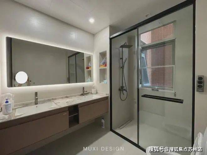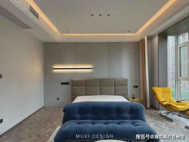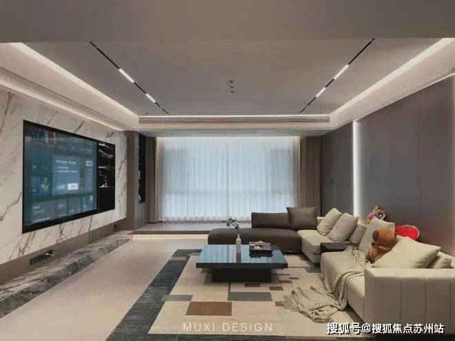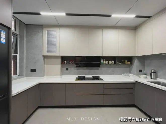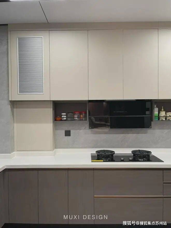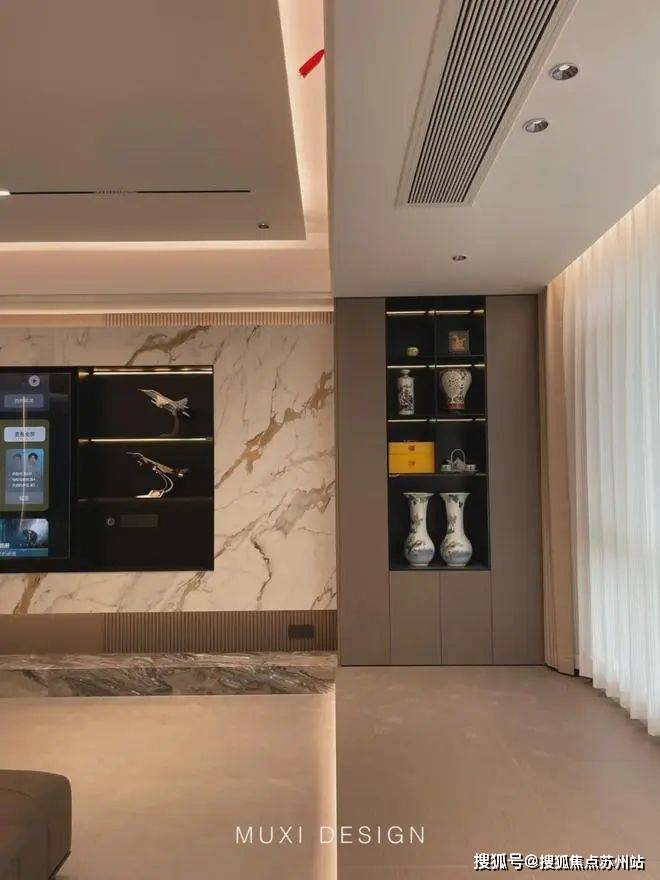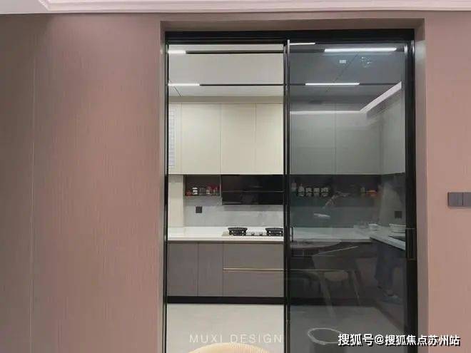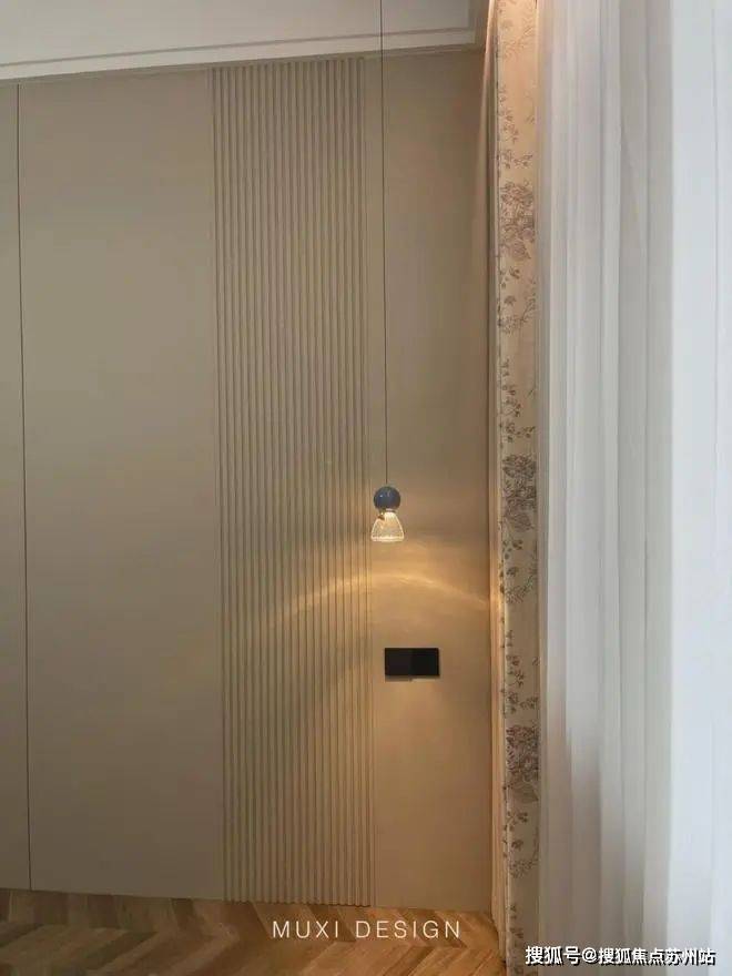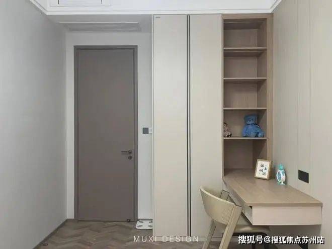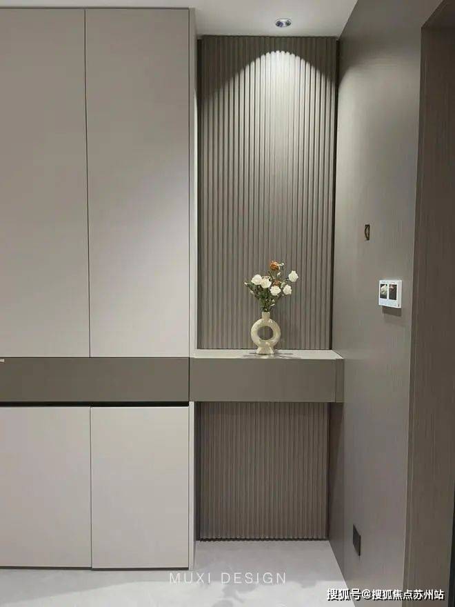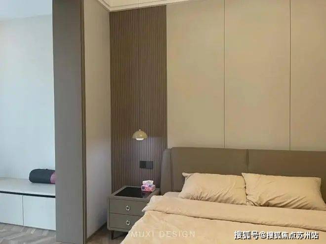 一进门就能看见顶天立地玄关柜,中间做了处理,白色柜子插入一道棕色隔板,让玄关整体不那么呆板。客厅背景选用栅格栏和岩板的组合,中间加入两条灯带动感十足,岩板的花色随性又优雅,与全屋调性一致,黑棕配色的真皮沙发堪称经典。玄关连接餐厅的地方做岛台设计,和餐边柜一起形成一个L型既隔开了空间也方便拿取东西,在这里喝个小酒也是非常惬意的。圆形的双层岩板餐桌,可以随意转动,围成一个温馨的餐厅氛围。主卧空间大的像一个客厅一样,让人心生羡慕,原始空间是两个相邻的房间,打通之后空间就大了起来。卧室也不单单只有睡觉的功能,还兼具电竞区,衣帽区和休闲区。老人房低饱和度的色系,轻易就打造出一个安静的睡眠环境。一门到顶实木衣柜,奶油白的颜色温和亮眼,衣柜衍生出书桌,柜板下面安装了灯带,亮灯时也很有安全感。因为家中有老人和小孩,对油烟味比较敏感,所以没有做开放式厨房,用联动推拉门隔开餐厅,隔味效果好。