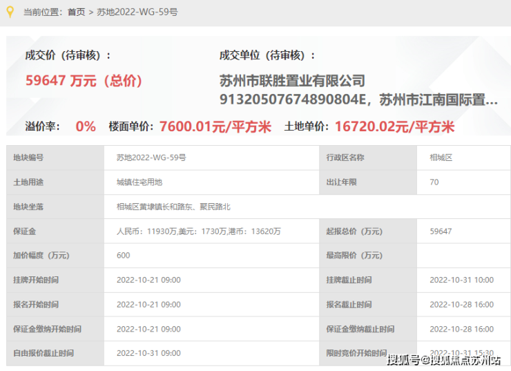 青云台,即联胜&江南国际59号地块,位于相城区黄埭镇长和路东侧、聚民路北侧,2022年10月由苏州市联胜置业有限公司&江南国际联合底价竞得!成交总价59647万元,成交楼面价7600元/㎡,溢价率0%。