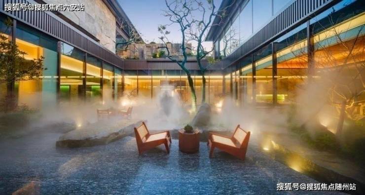 穿过景墙是下沉水院,连着售楼大厅和松林剧场,一边是水瀑潺潺,流淌成一幅古雅的宋韵山水画卷,一边是肆意舒展的罗汉松、老红梅、羽毛枫,铺展出悠远的东方意境。