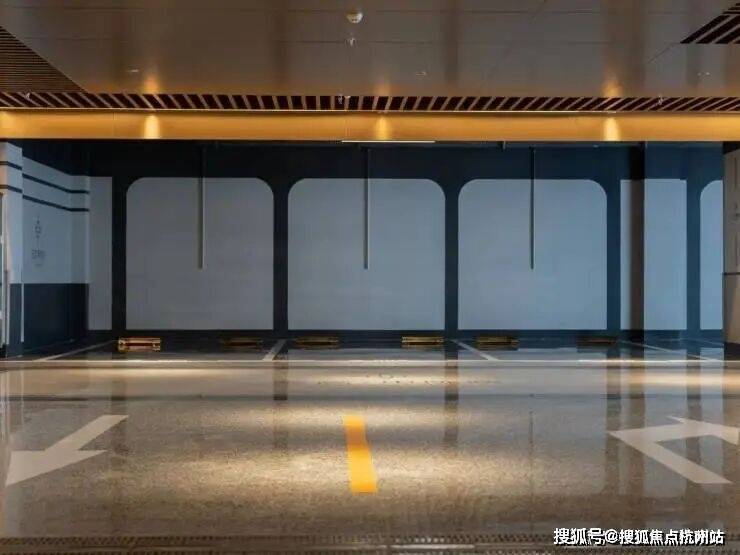 步入地库内部,视线瞬间被彻底打开。顶部采用长达约3米的蜂窝铝板与铝方通格栅铺陈,线性灯带像光流般贯穿其中,让整个空间具备了“酒店式下沉大堂”的仪式感。