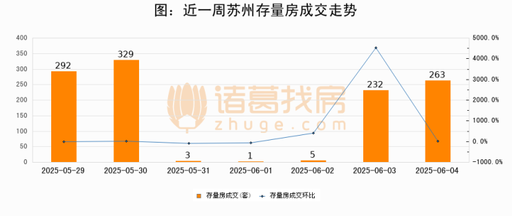 从存量房来看,2025年06月04日苏州存量房单日成交263套,比昨日增加31套,环比上涨13.4%。从近一周存量房成交来看,苏州存量房日均成交套数为160套,06月04日单日成交263套,高于近一周平均水平64.4%。