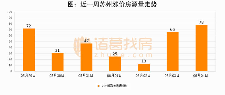 根据诸葛找房数据显示,苏州24小时涨价房源量为78套,较06月03日增加12套,环比上涨18.2%。与此同时,涨价房源占比小幅扩大,业主信心有所提升。
