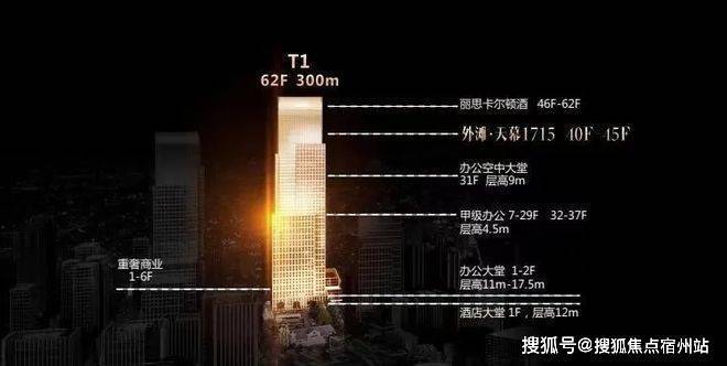 T1-300米超高层上部,46-62层为五星级酒店(丽思卡尔顿)38-40-45层为行政公馆!中部7-37层为甲级办公,底部为商业及大堂!