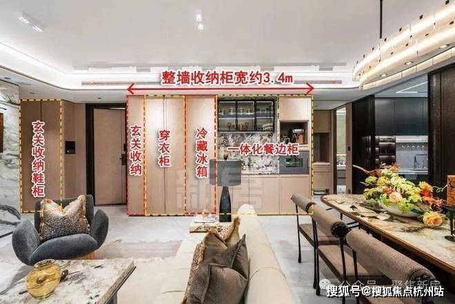 客厅进门处更是打造了整墙收纳柜长度约3.4m,包括穿衣柜、冷藏冰箱、玄关收纳,甚至过道还有玄关收纳柜,完美收纳各类衣物包包毫无压力;