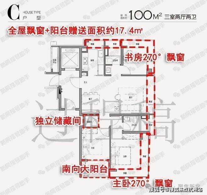 3、空间升级:超配双270°飘窗格局!市面上很少会有主卧及书房均设计270°飘窗的百平户型,稀缺性不言而喻~