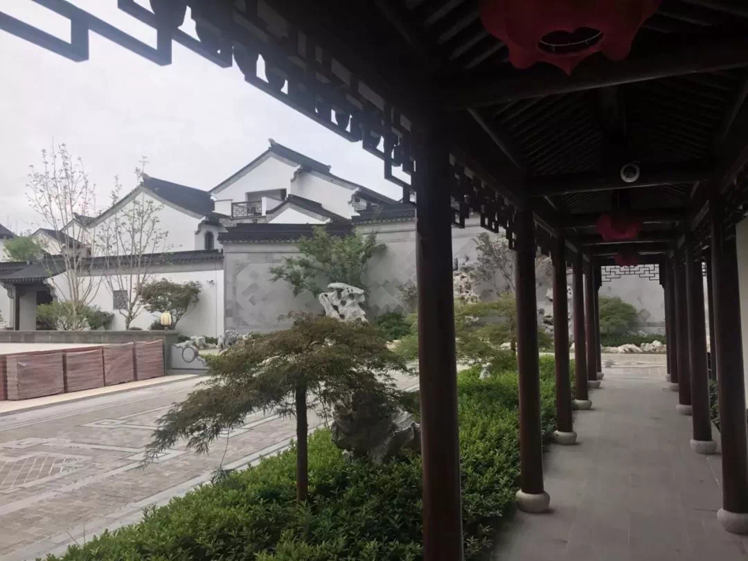 社区内景观也基本打造完成,山石、走廊均体现江南小桥流水的意境。