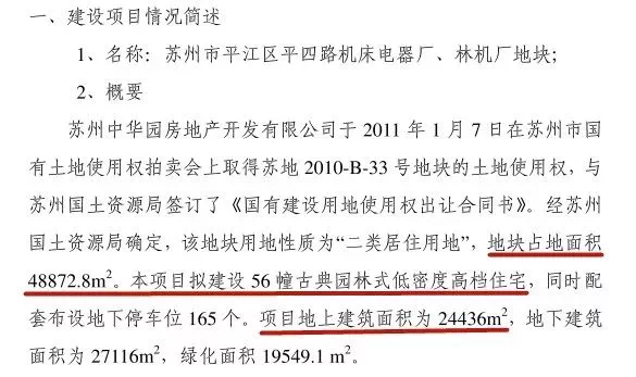 根据2011年的土地和规划信息,苏地2010-B-33号地占地面积为48872.8㎡,较大容积率为0.5,地上建筑面积为24436㎡,规划56幢古典园林式低密度高档住宅。照此计算,平均每一幢住宅计容面积约436㎡。