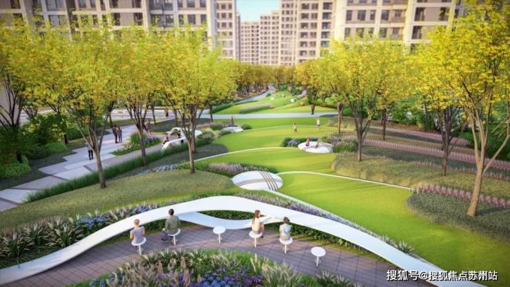 效果图公园+花园的双园社区、品质归家入口、特色阳光草坪、双会客系统、主题儿童乐园、健身系统六大功能价值叠加由三条不同主题的林荫步道和三个圆形景观节点组成的全区漫步系统,共同构建“6+1”森O₂家园。