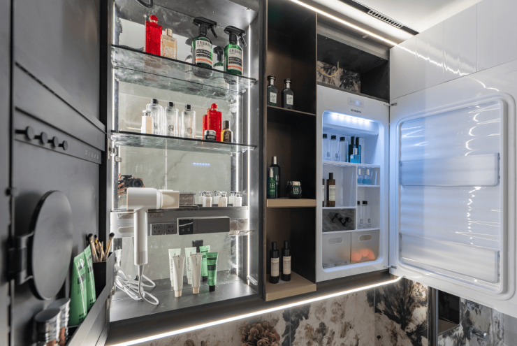 值得一提,保利戳中女性需求,主卫新增科勒美妆龙头,水流角度贴合化妆、护肤需求;主卫镜柜嵌入美妆冰箱,贴心存储口红、面膜等护肤品.