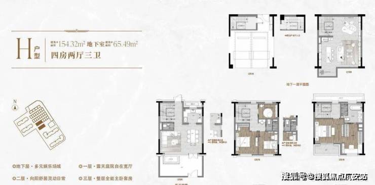 一楼和地下室主社交和志趣,二楼是子女的房间,三楼是主人休憩区.