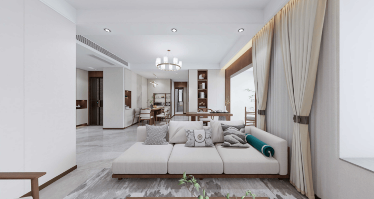 客厅做了灵动处理,可以做为大横厅使用,彰显气派,配上南向的宽景大阳台,显得十分明亮。