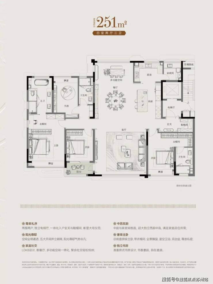 四房两厅四卫,3套房设计,全明卫生间。LDKB一体化,中西双厨,带茶室、家政间,功能性和空间感都拉到最满。