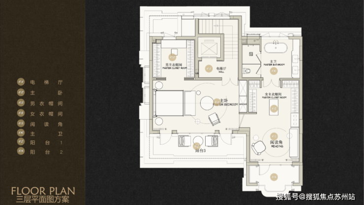 三层为总统级豪华主卧,两个衣帽间,双阳台,书房及豪华主卫。