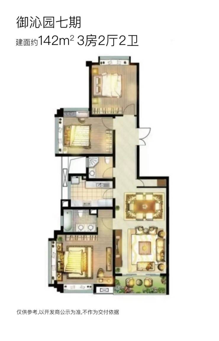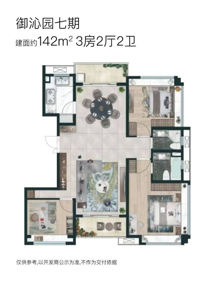 御沁园七期将推出3栋18F高层住宅,两梯两户无连廊设计;将推建面约132~172㎡三房户型,其中: