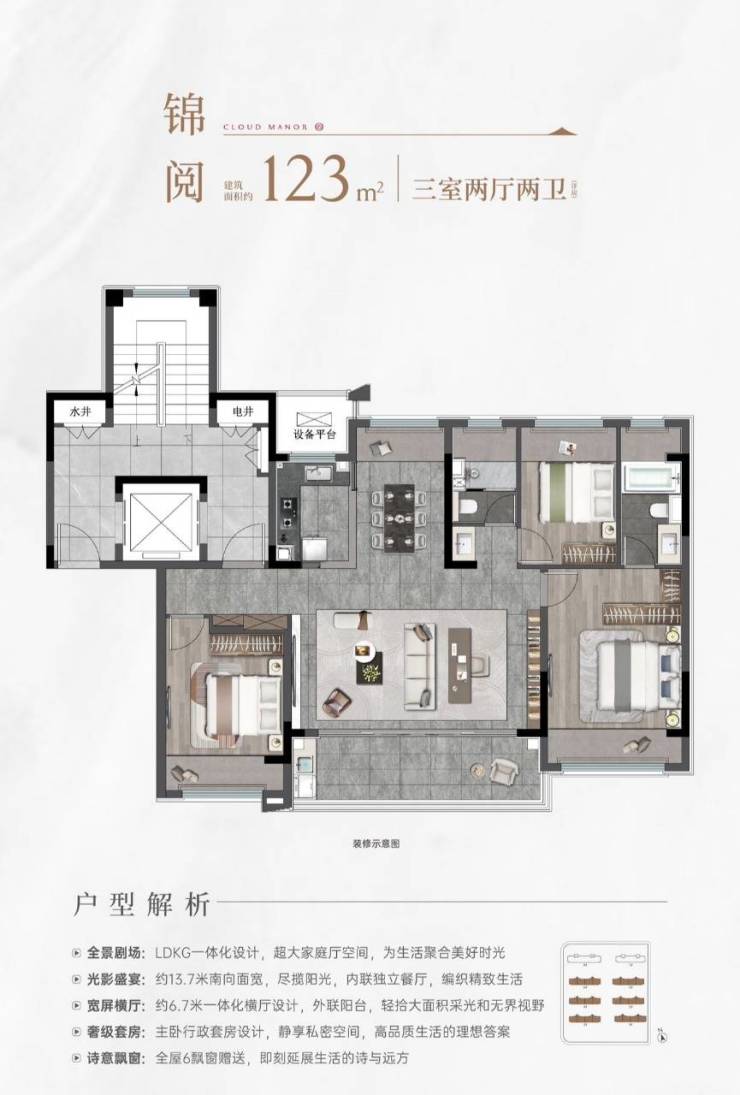 洋房123㎡:位于6-7层的低密洋房,得房率约80%,空间非常阔绰。
