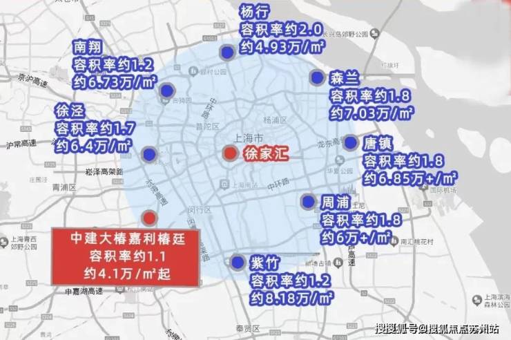 换个角度看,以徐家汇人民广场为中心,约20公里为半径,项目价格洼地的属性同样显而易见。