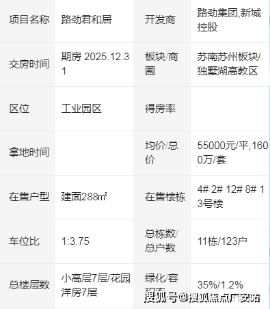 2、产品新,苏州路劲君和居售楼处电话☎:400-8828-814(售楼处预约看房热线)精装交付,而且标准不低,这给业主省了很多事;3、高总价、大面积筛选出苏州顶尖的圈层,仅123套,认知一致,后期问题会大量减少;