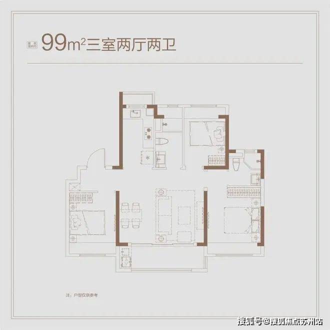 约99㎡3房2卫设计,有着约5.1米的大横厅设计,并且3.5开间朝南。