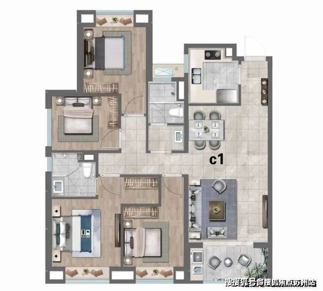 双南向卧室皆带飘窗,主卧大套房设计,带独立卫生间和衣帽间,让两代人都可以拥有专属的空间;
