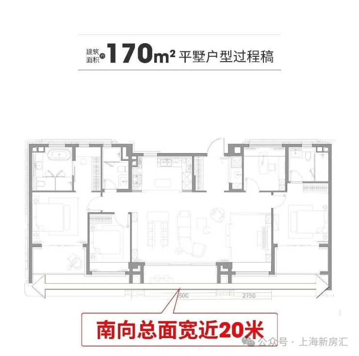 南向总面宽近20米,客厅和活动室加起来宽约9.25米,还做了双套房——主卧有独立卫生间和衣帽间,老人房也有独立卫生间,三代同堂住在一起也不挤,互不打扰。