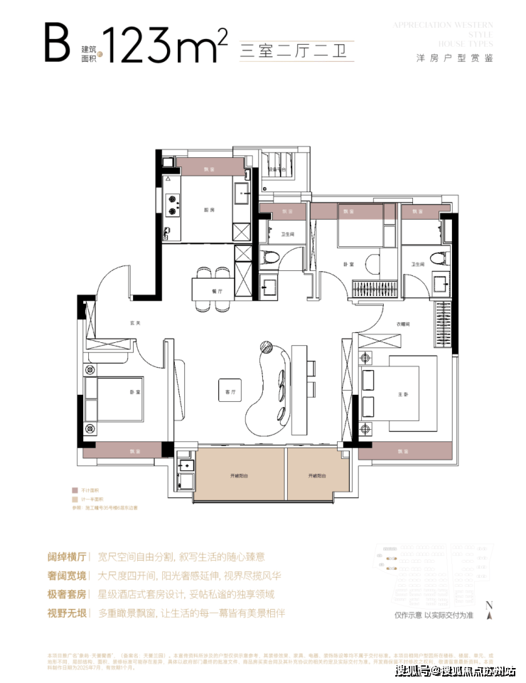 首开建面约123m3房2厅2卫(11F小高层)两种户型,后续还有叠加、联排