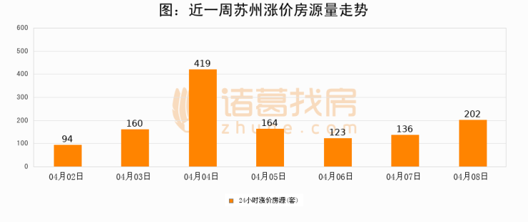根据诸葛找房数据显示,苏州24小时涨价房源量为202套,较04月07日增加66套,环比上涨48.5%。与此同时,涨价房源占比小幅扩大,业主信心有所提升。