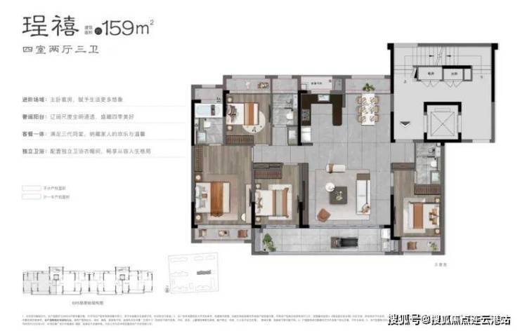 户型设计:全系124-159㎡四房,南向阳台仅计一半面积,飘窗及设备平台不计入产权面积