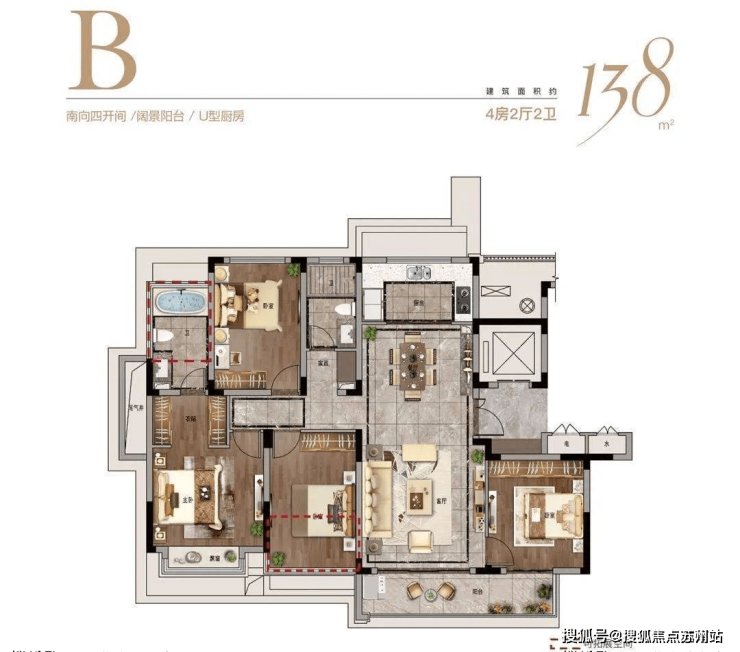 这是泊朗廷的几个户型里,笔者最喜欢的。四开间朝南,超大采光面。南北双露台,厨房也很大。缺点还是南次卧到客卫动线稍长,北面书房看起来稍小。