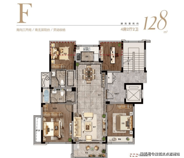 拓展了大半个主卫,小半个次卧。四开间朝南,南北通透。相比128㎡,房间空间更大,居住舒适度更加。