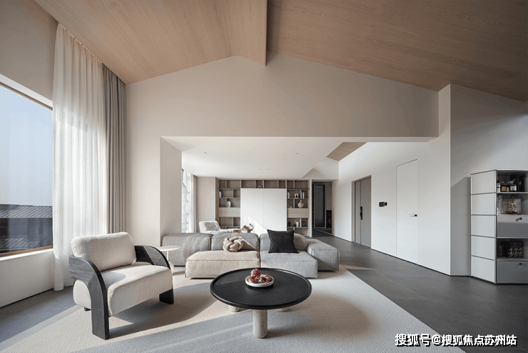 两面式沙发,打造出更随意的坐卧选择与舒适体验。木质吊顶铺展延伸,层次错落有致,仿若将室外的自然意境延伸到了屋内,简雅质朴而温润有加。