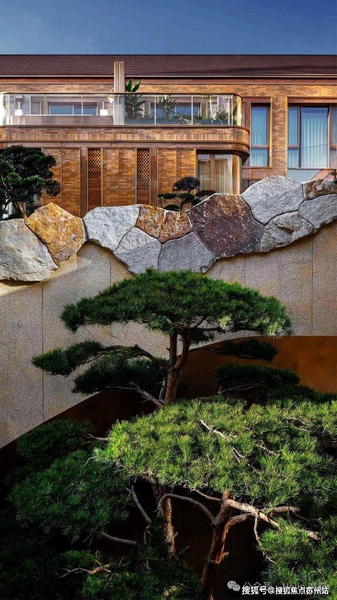 山水庭院汲取《足立美术馆》的造境手法,以老石皮、百年古木原样搬运,重现山间岁月的自然痕迹,与庭院中的光影交织,仿佛将山间的自然采光与静谧之感搬入城市。阳光透过树梢洒落,石皮上的纹理在光影中若隐若现,宛如一幅流动的自然山水画卷。