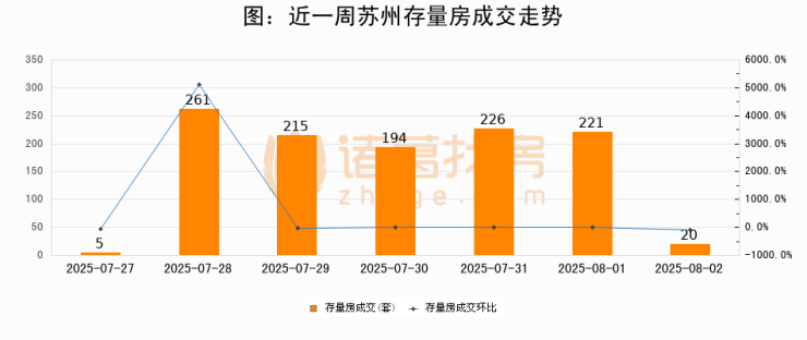 从存量房来看,2025年08月02日苏州存量房单日成交20套,比昨日减少201套,环比下降91%。从近一周存量房成交来看,苏州存量房日均成交套数为163套,08月02日单日成交20套,低于近一周平均水平87.7%。