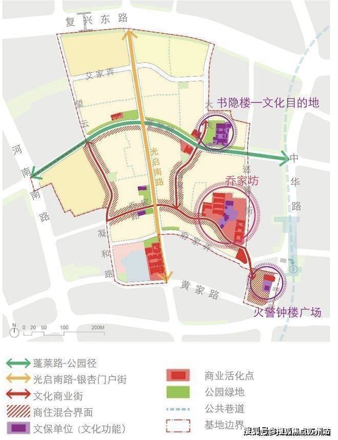 其中新增商业量为10543㎡,历史建筑活化为5900㎡,文保单位活化为5228㎡;具体分布如下: