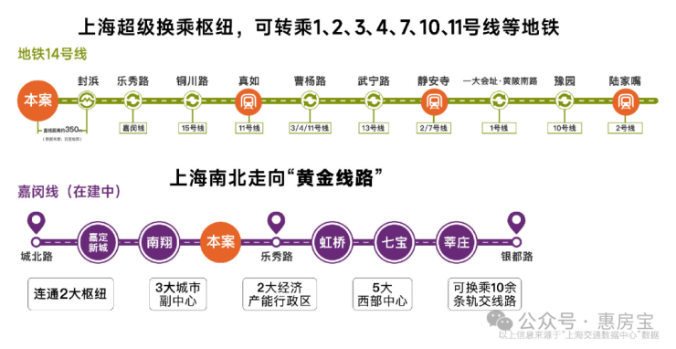 交通能级不断跃升:14号线和嘉闵线(在建中)双轨交汇,直线距离约350米14号线地铁口,14号线为高能级地铁线,5站普陀,直达静安,且始发有座,出行舒适;黄金走廊嘉闵线加速建设,约3站虹桥枢纽,未来可速达七宝、徐家汇、莘庄等核心区域。项目周边开泰路即将建成,绿野谷二期路段、骏达路、童家桥路、昌瑞路、涟澜路已启动建设,预计2026年建成。