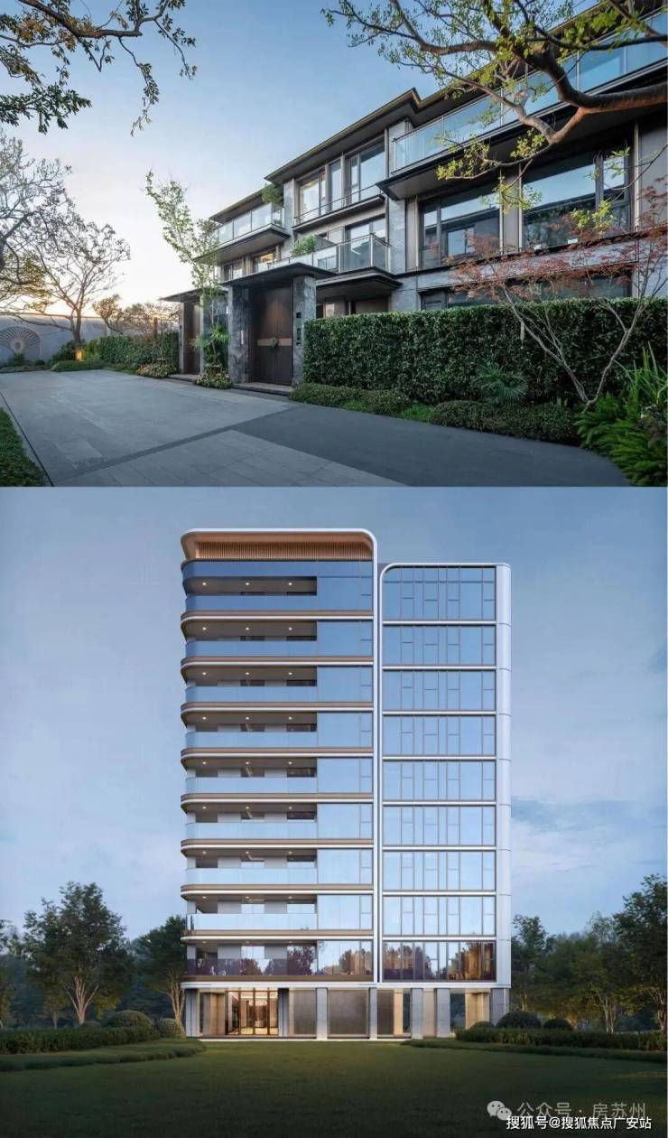 凤起冕旒|东方礼序的当代演绎;主入口门头以古代礼冠“冕旒”为灵感,采用现代设计语汇,构筑约85米“凤起冕旒”华贵门仪。景泰蓝垂幕「旒珠振玉」镶嵌其间,既呼应传统东方礼制,亦致敬苏州的时代封面与源点气质。门庭景观取罗汉松、朴树等珍稀树种,将奢石、水景与自然精巧融合,构筑一方承袭千年盛韵的尊荣之境。