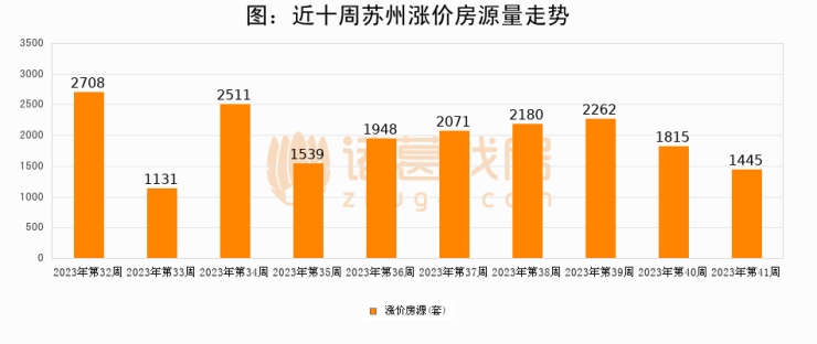 从调价房源来看,第41周苏州涨价房源1445套,较上周下降20.4%。与此同时,41周涨价房源占比回落0.36个百分点,业主信心小幅波动,购房者可则需入市。